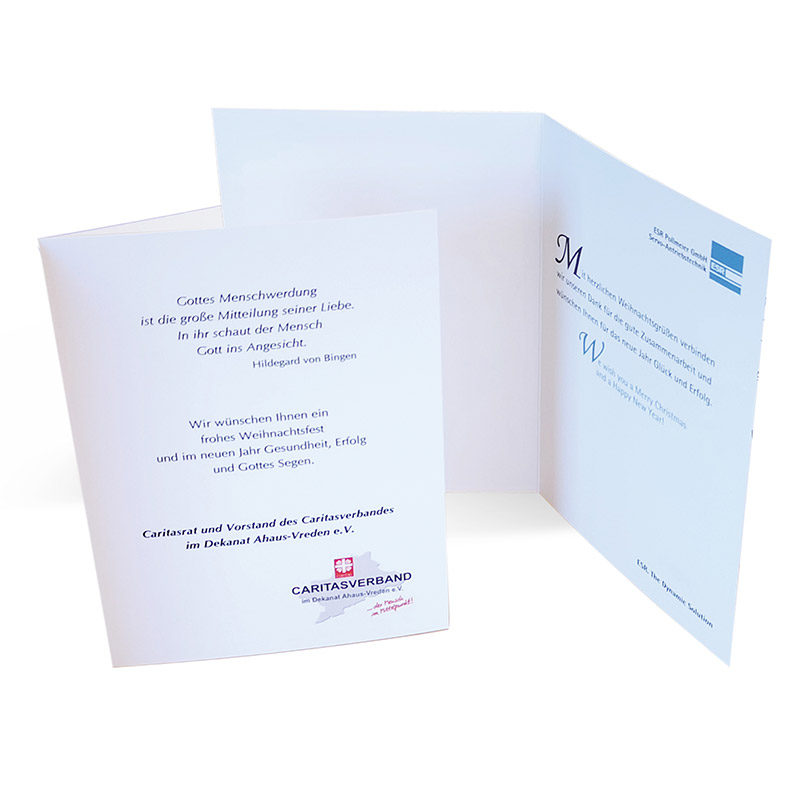 Gestalten Sie Ihre Gruß- und Weihnachtskarten ganz individuell mit Ihrer Unterschrift, Ihrem persönlichen Text und auch auf Wunsch mit Ihrem Logo. Ihr persönlicher Berater steht Ihnen bei der Umsetzung gerne zur Verfügung. Wir freuen uns über Ihre Anfrage.