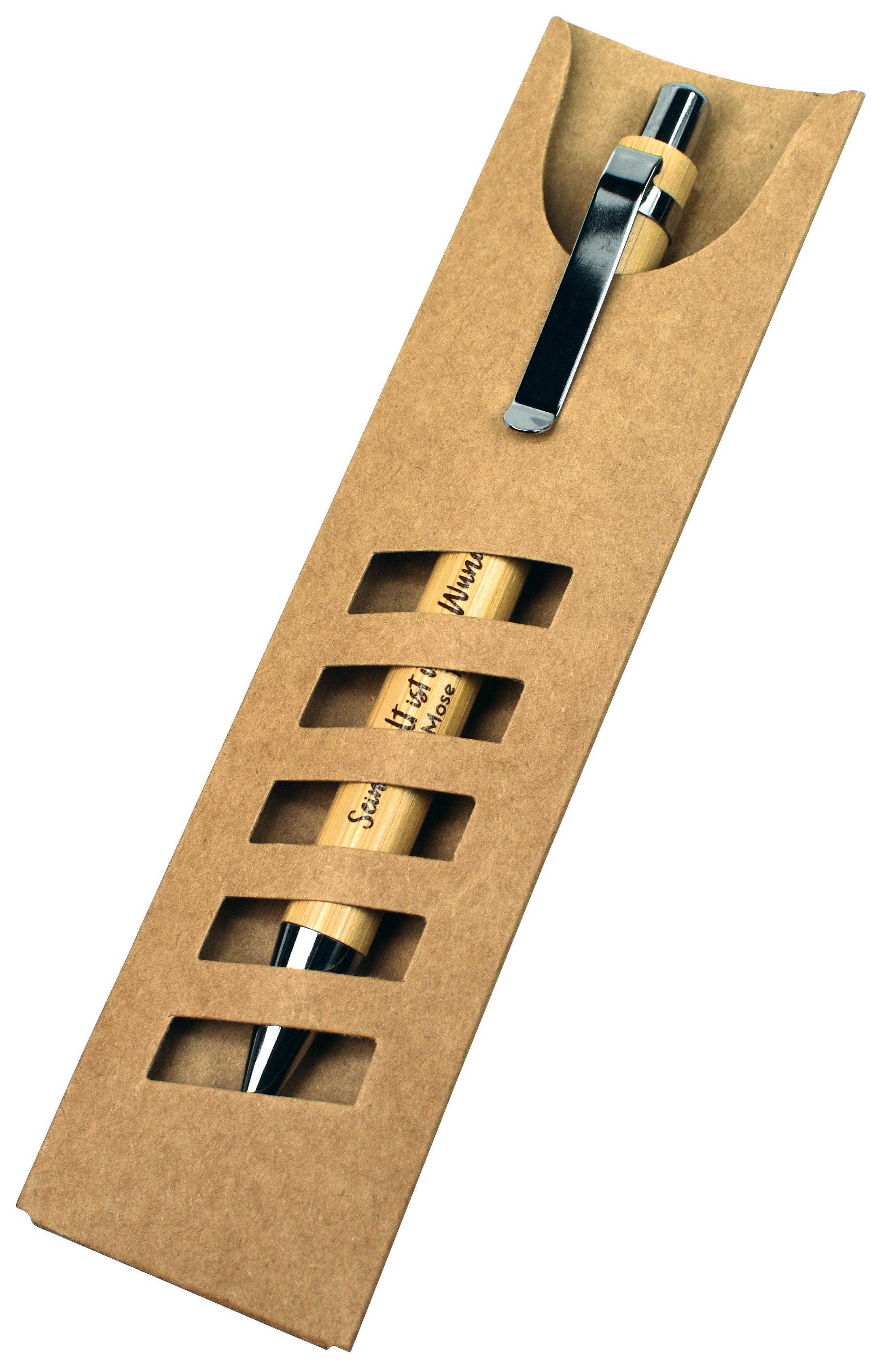 Kugelschreiber mit Bambusgehäuse und Metallclip, mit Aufdruck "Seine Welt ist voller Wunder", in farblich passendem Pappetui verpackt, Minenfarbe: blau