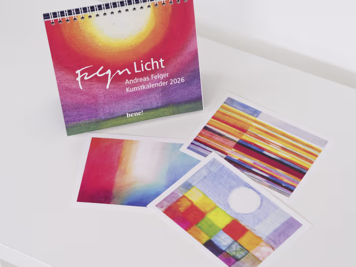 Die Auseinandersetzung mit Licht nimmt im Werk von Andreas Felger von je her eine zentrale Bedeutung ein. Licht ist es, was der Welt, wie wir sie sehen seine Farben verleiht, was Landschaften zum Vibrieren bringt und seinen Ausdruck auch in spiritueller Symbolik findet. Meisterhaft versteht Andreas Felger Licht besonders in seinem abstrakten Werk leuchtend und kontrastreich zum Ausdruck zu bringen. Seit über 40 Jahren erfreuen sich die Kalender des Künstlers großer Beliebtheit.